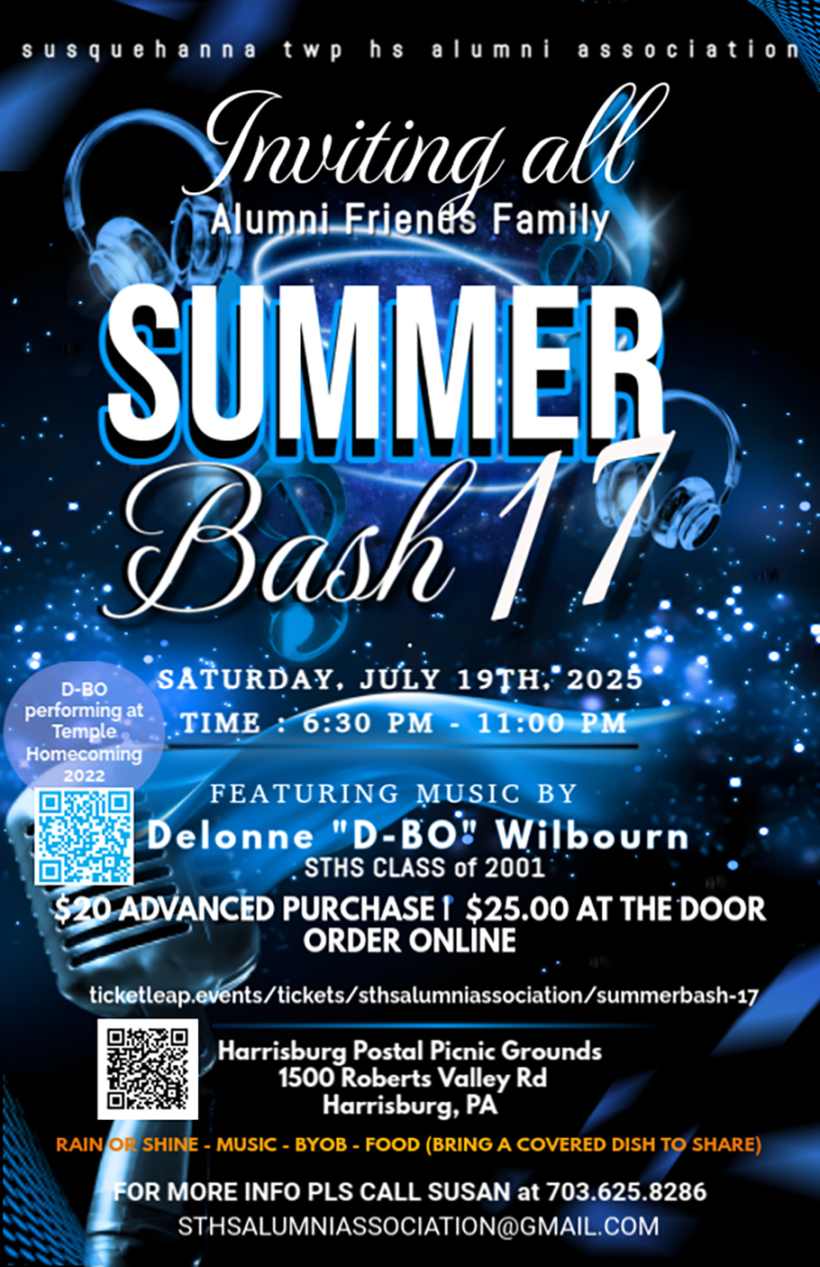 The Summer Bash is an outdoor event held at the Harrisburg Postal Grounds, 1500 Robert Valley Road on Blue Mountain each July since 2006. Always the 3rd Saturday in July. The Bash originally started as a birthday celebration by a group of friends from the STHS Class of 76 and has grown into a 250+ person night of entertainment (STHS alums), food, and reconnecting with classmates of all years. In 2019, the Susquehanna Township Alumni Association took over the production of the Summer Bash as a fundraiser and as the foundation for an All Class Reunion. Guests are asked to bring a dish to share. BYOB. Grilled items (chicken or hamburger, sausage, hot dogs) are prepared at the event by the Alumni Association. The entrance fee is $20.00 before the event and $25.00 at the door. The entrance fee covers the cost of the bands. The Summer Bash is also a great and hassle-free Reunion site. In recent years, the classes of 74, 76, and 78 have held their reunions at the Summer Bash, while several others have used it as a part of a three-day weekend celebration.